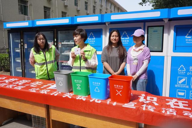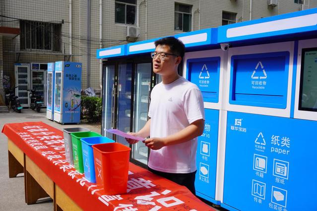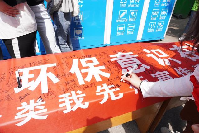 为使学生更直观感受到智能回收箱的功能,王慧详细说明了垃圾分类与蓝色智能回收箱的使用方法,演示了如何进行垃圾投放及积分的使用,随后邀请几名学生进行一分钱兑换体验并在横幅上签名。同时,她提到驿站的使用不仅能极大改善校园环境,而且也能提高学生的垃圾分类意识。讲解结束后,王慧随机提问了垃圾分类的相关问题,学生们积极回答。在回答过程中,学生深刻认识到垃圾带来的影响,更深刻地感受到垃圾分类的重要性。