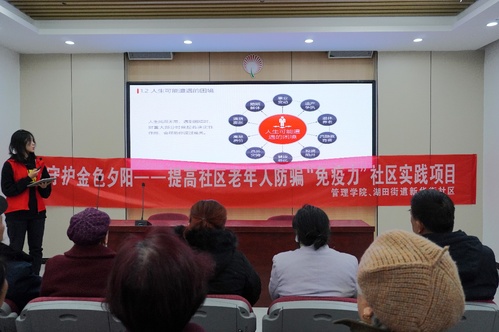 管理论坛、实战营销协会、会计学社的志愿者们通过PPT演示,用生动的案例和通俗易懂的语言,向老人们讲解了如何识别虚假信息、防范电信诈骗等知识,分析了骗子们利用老年人的心理和情感进行诈骗的手法。为了让老人们更加深入地了解这些知识,学生们还现场表演了一些情景短剧,模拟了常见的诈骗场景,让老人们在轻松愉快的氛围中学习如何应对诈骗。