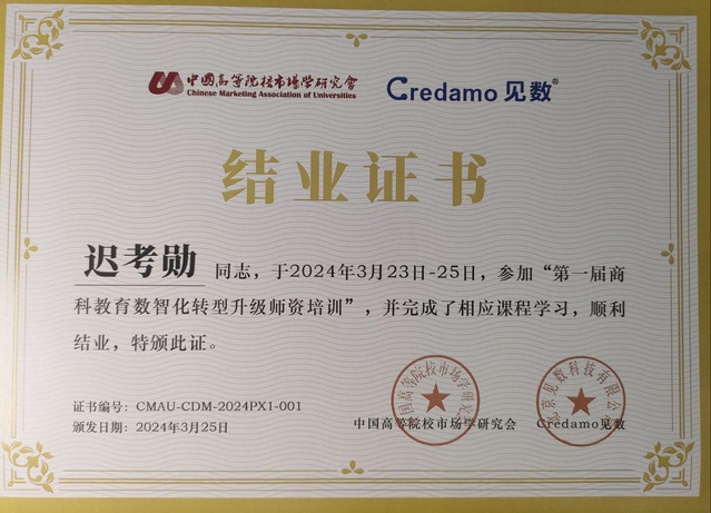 3月23日-25日,为满足学院专业及学科建设发展需求,管理学院副教授迟考勋参加了第一届商科教育数智化转型升级师资培训会议。本次会议培训主题为“商科教育数智化转型,赋能商业数智化人才培养”,来自全国60余所高校的130多名学者、教师参会,培训会由中国高等院校市场学研究会主办,得到了教育部市场营销专业虚拟教研室与清华大学出版社的大力支持。