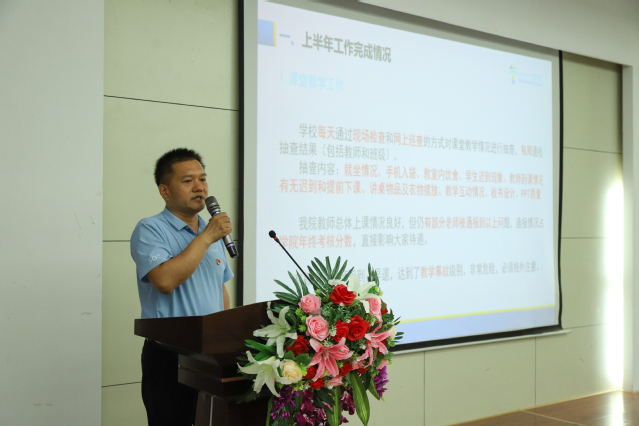 副院长胡付领从课堂教学、毕业论文、教师发展、教学研究、招生宣传等方面总结了上半年教学工作情况,他强调老师们务必严守教学规定,维持良好教学秩序,各类教学材料务必按时按要求归档;接着,胡付领对当前进展中的考试、教材征订、教改项目验收申报等工作做了详细部署安排,他也从国家级一流本科课程、省级教学成果奖筹划、省级基层教学组织等方面解读了学院下半年重点突破的教学工作。