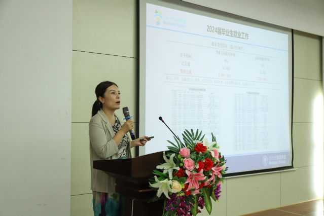党委副书记张佳介绍了2024届毕业生就业工作完成情况,她指出学生毕业离校不离线,鼓励老师们继续为学生推荐就业岗位,促进高质量就业,进一步提升学院毕业生就业率;然后,张佳汇报了本年度学院创新创业工作的进展情况,解读了《管理学院创新创业资助管理办法》,她指出我院上半年双创工作取得了一定成绩,但仍需老师们的积极参与和鼎力支持。