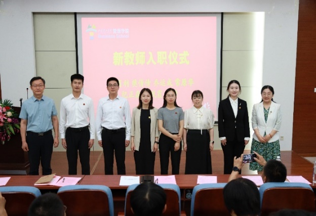 接着举行新教师入职仪式,杨直、孙秀梅为新入职教师纪正森、乔运程、王肖利、常原华、张凤霞、高琦佩戴校徽。