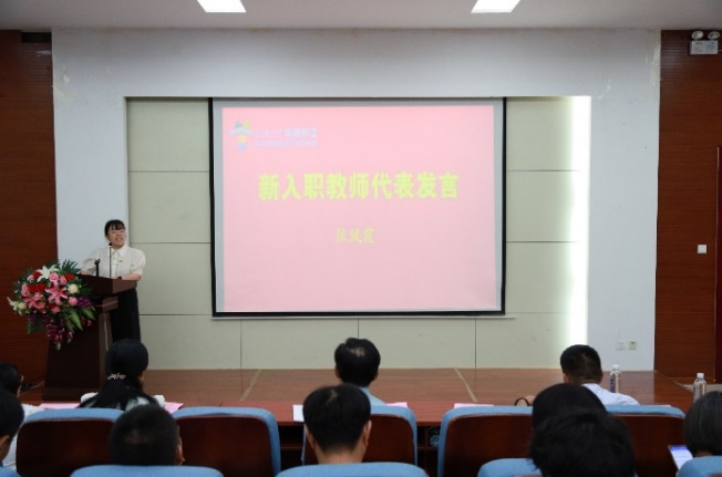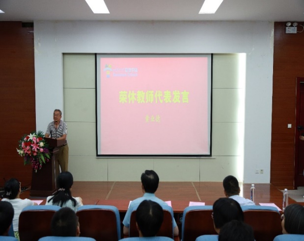 随后,荣休教师代表黄业德和新入职教师代表张凤霞分别上台发言。黄业德介绍了自己的奋斗历程和峥嵘岁月,解读了众多有益的教学经验与人生感悟;张凤霞分享了自己对教师职业的认识理解,也展示了对未来的憧憬与希望。