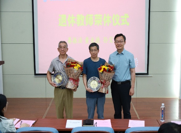 颁奖结束后,举办退休教师荣休仪式。学院团委书记李璐介绍了光荣退休的黄业德、孙宝连两位老教师的从教经历和卓越贡献,学院青年教师代表上台为其献花,杨直为两位教师颁发纪念奖盘。