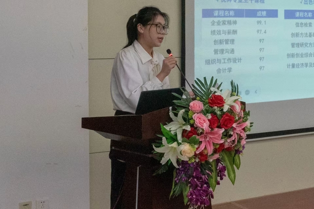 工商2101班亓育玺同学作为在校生代表上台发言,她从自己在大学期间所取得的学术和实践成果中总结经验,帮助同学们更好的认识自己,为新生提供有益的参考和启发。