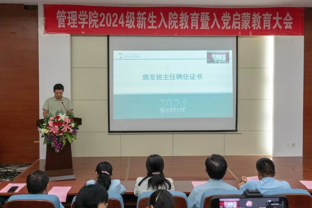 大会在庄严的国歌声中拉开序幕,学院党委书记杨直为2024级班主任颁发聘任证书。
