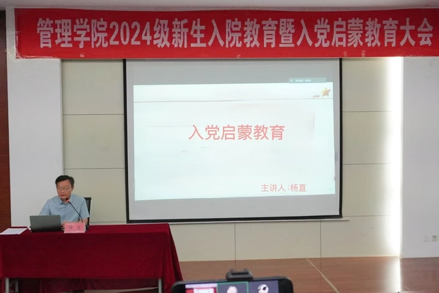 学院党委书记杨直为2024级全体新生开展入党启蒙教育。他分别从“中国共产党是一个什么样的政党”、“我们为什么要加入中国共产党”、“我们怎样才能加入中国共产党”三个方面进行阐述。他带领大家回顾中国共产党一百多年的辉煌党史,并通过深入浅出的阐释,对党的性质与宗旨、指导思想、基本路线和基本纲领等内容进行了讲解。随后,他着重强调了新时代大学生向党组织积极靠拢应有的政治觉悟与正确的入党动机,并就如何端正入党动机提出具体要求。同时,他详细介绍了入党申请书的撰写等相关事项,提醒新生要注意党员发展过程中的时间节点