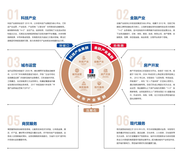 目前,华发集团已形成“科技、城市、金融”三大产业集群齐头并进的发展格局,区域布局从珠海拓展至北上广深等内地七十多个主要城市和香港、澳门等地。三大集群行业排位持续提升,科技产业集群锚定半导体、新能源、医疗健康及人工智能、智慧家居“3+2”核心赛道,已跻身“2024产业投资100强”第8位、“中国私募股权投资机构百强”第15位;城市产业集群城市运营板块蝉联中国产业新城运营商前10,房产开发板块稳居行业前15;金融产业集群位列中国地市级综合性金融投资平台前15,是中国地级市中牌照最齐全的综合金融运营平台之一。