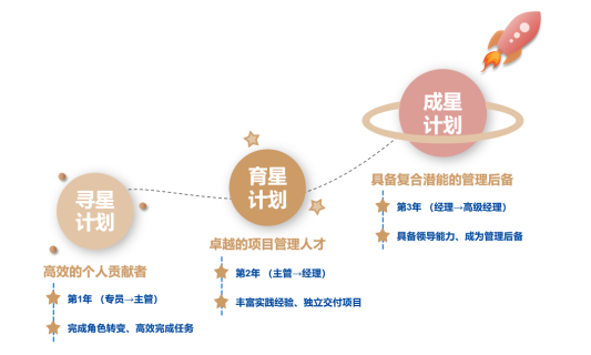 “华发新星”培养计划以“快速发展”为核心,将校招员工视作公司战略型人才进行培养。配备了完善系统的培养机制,如导师带教、挑战性任务、轮岗锻炼、专题实践、职场赋能等,多维度培养校招员工的综合能力,为校招员工的发展加足马力,最快可实现一年一晋升,三年内完成从职场新人到复合型管理后备的职业生涯大跨越。