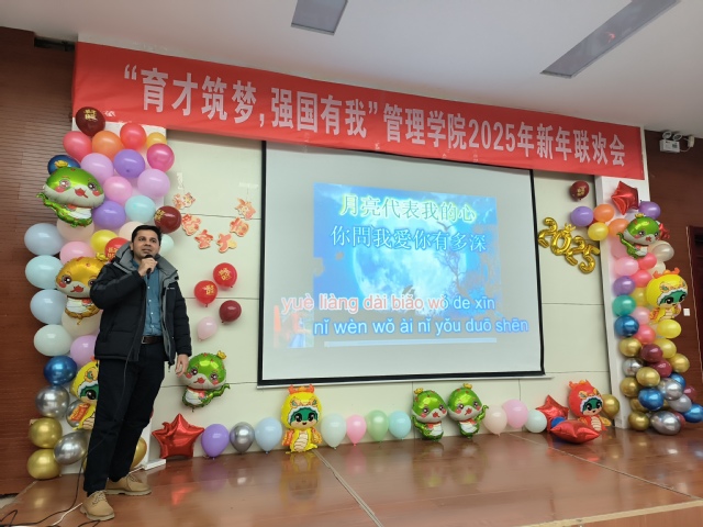 高群等4人带来的朗诵《蛇年灵蛇追梦想未来可期放光芒》,用深情的语言描绘新年的喜庆与希望,传递满满力量与期待。外籍教师爱马德演唱中文经典歌曲《月亮代表我的心》,跨文化交流的温暖引发全场掌声与欢呼,联欢会的一大亮点。师生同乐,学生也为教职工联欢会献上精彩节目。曹文彬等5人表演的小品《面子》幽默风趣,传递生活哲理,赢得满堂喝彩。本科生代表陈祎昕与宫奕辰对唱《我怀念的》,歌声动人,余音绕梁。研究生张筱迪等2人朗诵《新的一年新的期盼》,深情有力,表达对未来的憧憬与热忱。