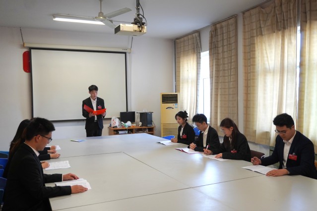 管理学院第六次学生代表大会在振奋人心的校歌歌声中闭幕。会后,新一届学生会主席团成员见面会于4号教学楼206会议室召开,管理学院学生会新一届主席团成员为第六届学生会秘书长马传金颁发聘书。
