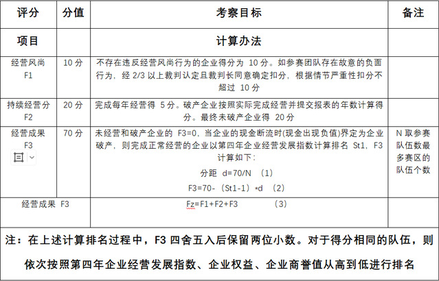 2. 第二阶段:包括“经营复盘推演(定人必答题)、质询对抗推演(定队必答题)、管理创新提案(抢答题)、团队协作展示(共答题)、巅峰对决(闯关冲刺题)”五个环节,参赛队在本队中自主选派3名选手参加竞赛,1名选手备选。竞赛总成绩为初赛成绩和校赛成绩的加权之和。计算公式为:竞赛总成绩=一阶段成绩×40%+二阶段成绩×60%。