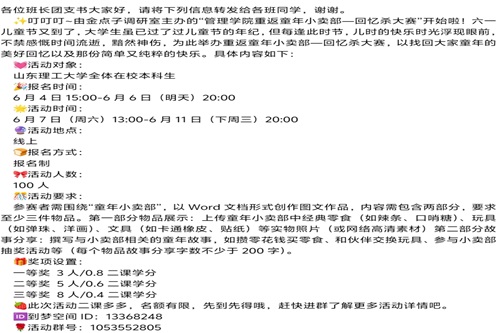 此次重返童年小卖部——回忆杀活动由金点子调研室社团主持操办,同学们通过线上投稿的方式进行比赛,报名时间为6月4日至6月6日,活动时间为6月7日至6月11日。在活动举办前,管理学院金点子调研室社团积极宣传,通过多种途径在校园中广泛宣传,吸引了大量同学积极踊跃地参与此次活动。