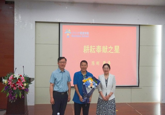 今年从教满30年的教师陈刚、周涛荣获“耕耘奉献之星”,学院青年教师代表为其献花,杨直和孙秀梅与其合影留念。