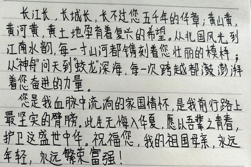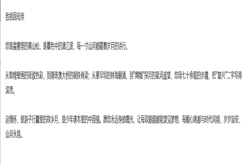 活动期间,参与者围绕“致祖国母亲”这一主题,创作200字以内的创意文案,内容涵盖对祖国山河壮丽景色的赞美、对国家发展成就的自豪、对民族复兴的坚定信念,以及对祖国美好未来的真挚祝福,充分展现了同学们的创意与才华。尤其是获得一等奖的刘彦汝同学用文字传递爱国情怀,展现了新时代青年积极向上的精神风貌,愿为祖国的繁荣发展贡献自己的青春力量。