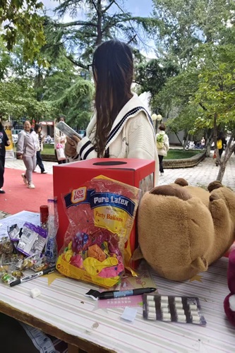 活动当天,心晴驿站的摊位前人头攒动,精心设计的互动环节成为现场的一大亮点。社团成员特意准备了色彩鲜艳的抽奖箱,设置了层次丰富的奖项:一等奖为卡皮巴拉等玩偶;二等奖是印有社团Logo的暖心周边,包括帆布包、纪念徽章;三等奖则为精心挑选的小零食与祝福卡片。同学们只需参与简单的心理健康小问答或趣味拼图游戏,即可获得抽奖机会,现场欢呼声与笑声不断,气氛十分热烈。