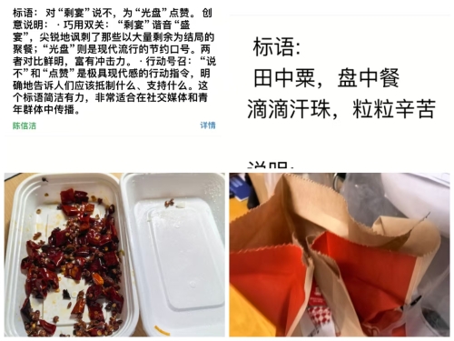 活动开始后,参赛者们创建了自己的相册,每天都坚持上传自己光盘行动的照片。参赛者们通过合理点餐,防止浪费,从自身做起,并带动身边的朋友加入到光盘的行列里来。在一张张光盘的照片中,能够看到他们节约粮食的决心,能够感受到中华民族勤俭节约的传统美德的弘扬。参赛者们所创作的标语铿锵有力,海报发人深省。简短的话语传播了爱粮节粮的思想,海报重点突出,明确了节约粮食的美德。