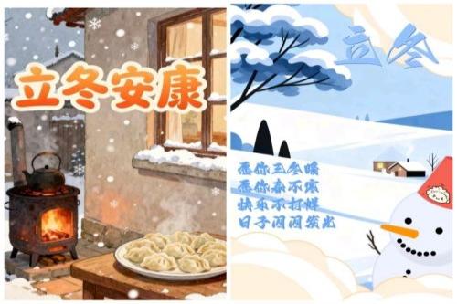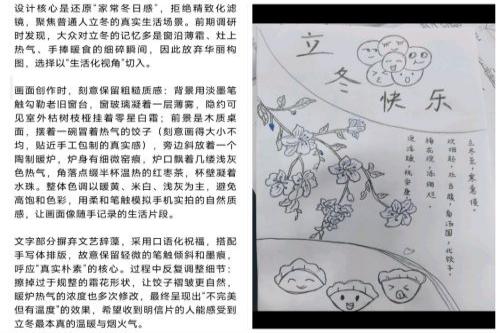 参赛者们以小组智慧创作了包含冬日雪景、饺子、冬日祝福等元素的明信片,用文字与图画传递了真挚的情感,让传统节气的文化韵味在创新中焕发了生机。而以小组形式制作明信片能够提高参赛者们的小组合作能力,领导能力,组织能力等,借助“立冬”这一节气也增强了同学们的文化自信。