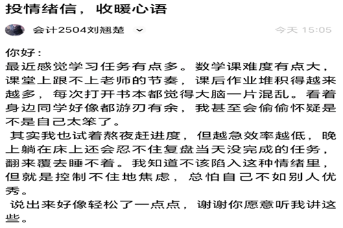 学业推进的焦虑、人际关系的困扰日益成为同学们的情绪痛点,安全的情绪倾诉渠道亟待搭建,金点子调研室主办的“投情绪信,收暖心语”活动正式启动。此次活动以“倾听情绪·温暖陪伴”为核心宗旨,助力同学们疏解学习生活中的压力与负面情绪,为同学们打造包容、安全的情绪表达空间,让倾诉得到回应、烦恼得以安放,进而传递互助关怀的校园温度,为构建身心和谐的校园环境注入力量。
